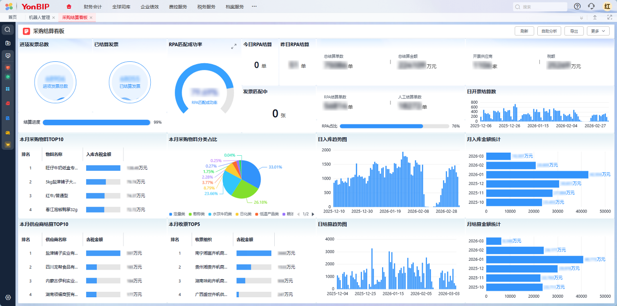 上游几千家供应商每天送货,过去对账结算要耗掉大量人力,一张单子来回核对,费时费力还容易错。现在用RPA数字员工自动收票、查验、三单匹配、自动入账,八成以上的采购结算不用人管,结算团队从几十人精简到寥寥数人,效率翻了几倍,准确率反而更高。